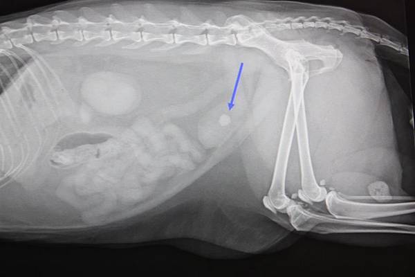 數位影像系統檢查下發現的膀胱結石 (箭頭處)