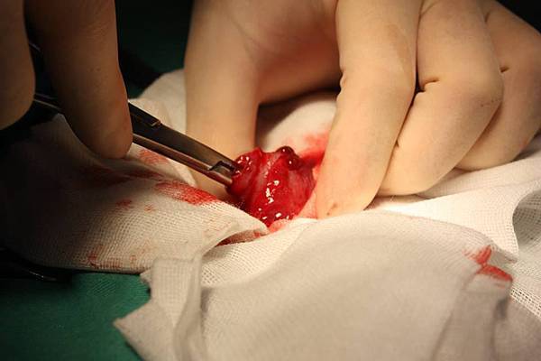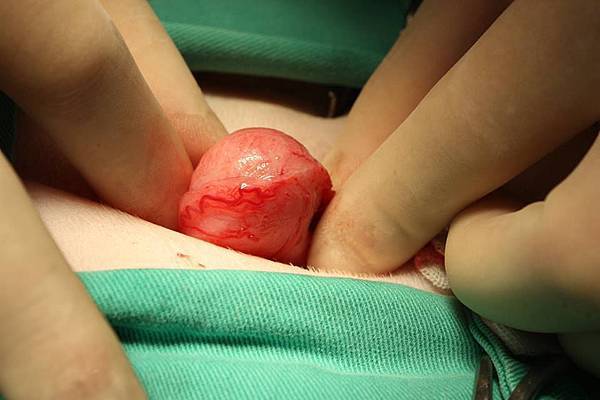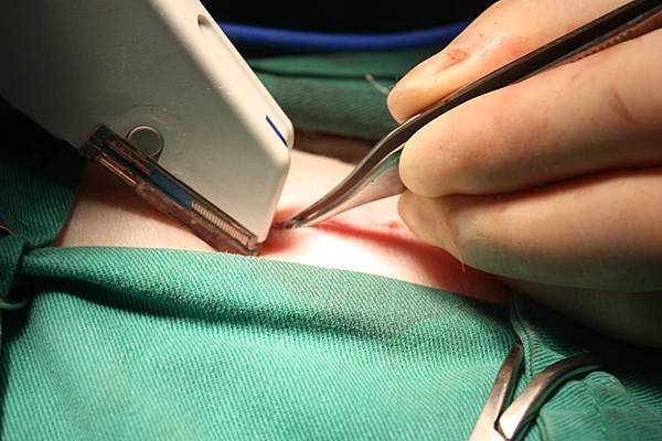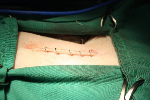 將膀胱以無菌生理食鹽水沖洗膀胱後關閉傷口(採用美國高級可吸收線)