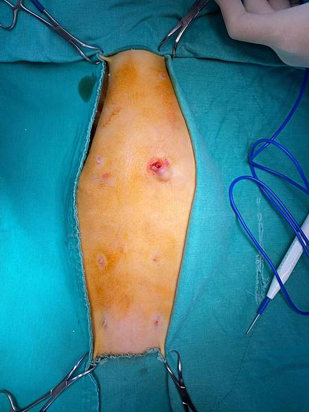 ►這個15歲貓貓因為右側第2乳腺的團塊就診,診斷為惡性乳腺瘤,因為我希望能大範圍切除腫瘤,又希望癒合的過程不要造成貓貓太大的負擔,所以決定先完成右側全乳腺切除。